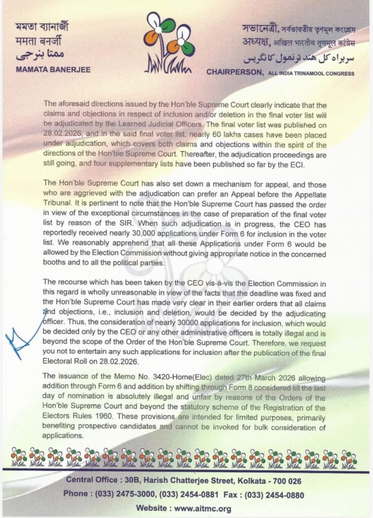 চিঠিতে আরও দাবি করা হয়েছে, বর্তমানে ৬০ লক্ষের বেশি প্রকৃত ভোটারের নাম বিচারাধীন অবস্থায় রয়েছে। ত্রুটিপূর্ণ SIR প্রক্রিয়ার কারণে ইতিমধ্যেই ২০০-র বেশি মানুষের মৃত্যু হয়েছে বলেও অভিযোগ তোলা হয়েছে। এই পরিস্থিতিতে ভারতের Election Commission of India অত্যন্ত সন্দেহজনকভাবে ওই জালিয়াতিপূর্ণ আবেদনগুলি বন্ধ দরজার পিছনে গ্রহণ করার জন্য তাড়াহুড়ো করছে বলেও অভিযোগ করেন অভিষেক।