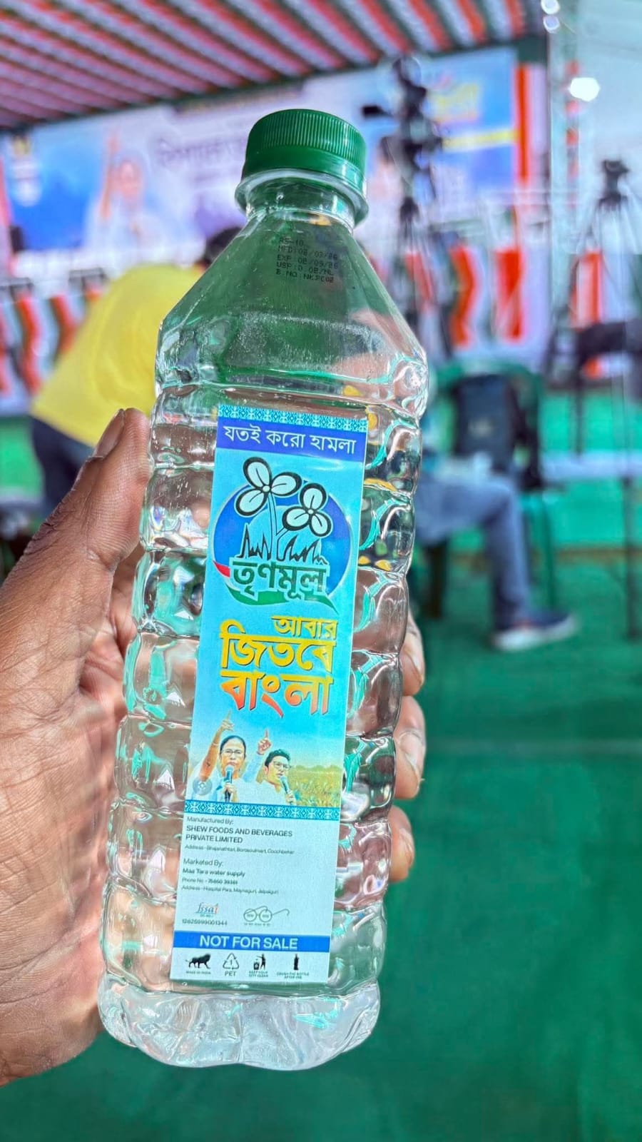 তবে রাজনৈতিক ভাষণ বা জনসমাগমের বাইরেও ময়নাগুড়িতে নজর কাড়ল এক ব্যতিক্রমী দৃশ্য। প্রচারের ভিড়ে পতাকা ও ব্যানারের পাশাপাশি জলের বোতলেও দেখা গেল রাজনৈতিক বার্তা। তীব্র গরমে সভাস্থলে উপস্থিত মানুষের হাতে তুলে দেওয়া পানীয় জলের বোতলের গায়ে লাগানো ছিল ‘আবার জিতবে বাংলা’ লেখা স্টিকার।