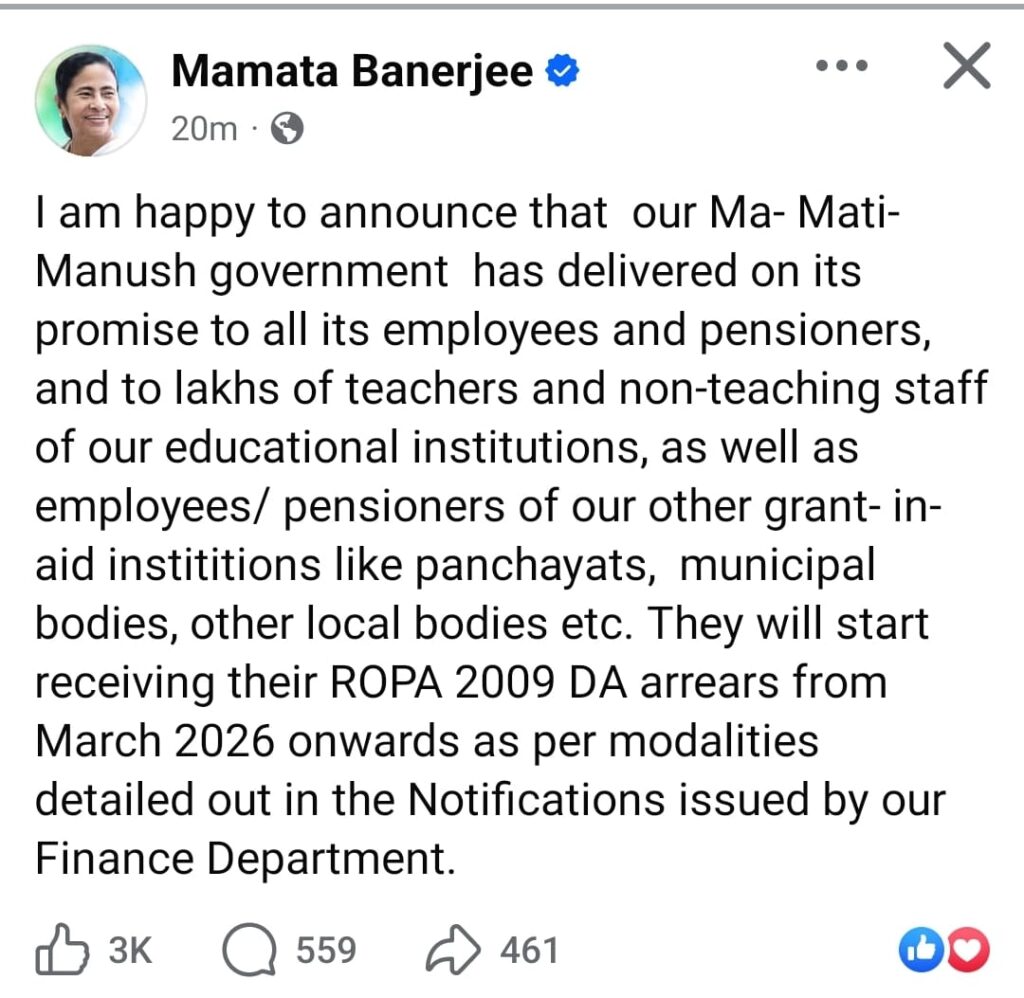সোশ্যাল মিডিয়ায় প্রকাশিত বার্তায় মুখ্যমন্ত্রী বলেন, রাজ্যের ‘মা-মাটি-মানুষ’ সরকার কর্মীদের কাছে দেওয়া প্রতিশ্রুতি পূরণ করছে। অর্থ দফতরের জারি করা বিজ্ঞপ্তি অনুযায়ী রোপা ২০০৯ কাঠামোর অধীনে প্রাপ্য ডিএ মার্চ ২০২৬ থেকে কার্যকর হবে।