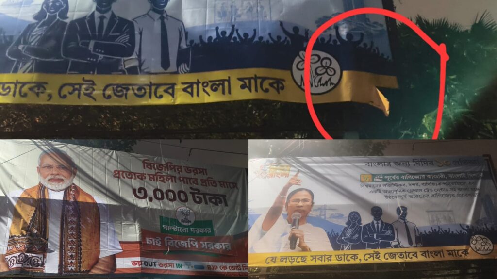 সুমিত দে,কলকাতা: রাত গভীর। চারদিক নিস্তব্ধ। সেই সুযোগেই শুরু হয়েছে এক চাঞ্চল্যকর কর্মকাণ্ড। অন্ধকারের আড়ালে চুপিসারে ছিঁড়ে ফেলা হচ্ছে মমতা বন্দ্যোপাধ্যায়-এর ব্যানার, আর মুহূর্তের মধ্যে সেই জায়গা দখল করে নিচ্ছে নরেন্দ্র মোদি-র পোস্টার।