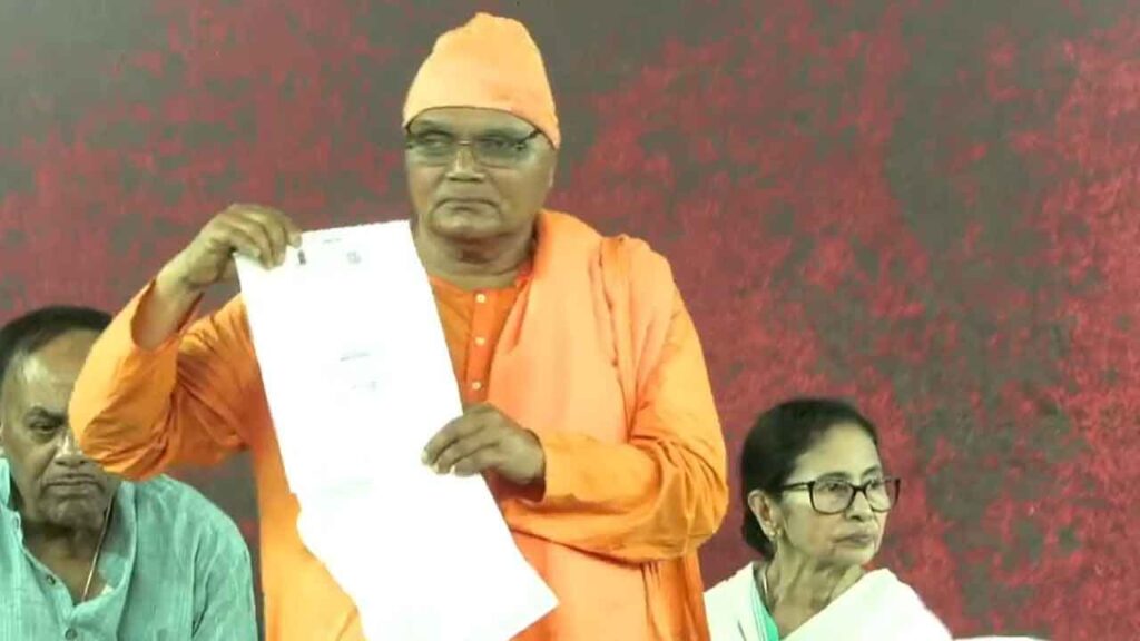 সন্ন্যাসী যখন মঞ্চে দাঁড়িয়ে নিজের নথি দেখাচ্ছিলেন, তখনই মুখ্যমন্ত্রী আরও দাবি করেন,