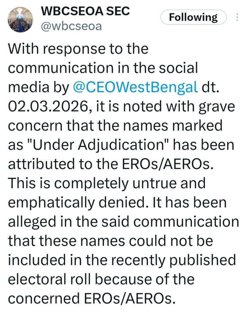 গত ২ মার্চ কমিশনের পক্ষ থেকে সমাজমাধ্যমে দাবি করা হয়, ইলেক্টোরাল রেজিস্ট্রেশন অফিসার (ইআরও) এবং অ্যাসিস্ট্যান্ট ইলেক্টোরাল রেজিস্ট্রেশন অফিসারদের গাফিলতির কারণেই বহু আবেদন চূড়ান্ত ভোটার তালিকায় অন্তর্ভুক্ত করা সম্ভব হয়নি। এই মন্তব্যকে ‘অপমানজনক’ ও ‘ভিত্তিহীন’ বলে সরাসরি খারিজ করেছে ডব্লিউবিসিএস অফিসার্স অ্যাসোসিয়েশন (ডব্লিউবিসিএসইওএ)।